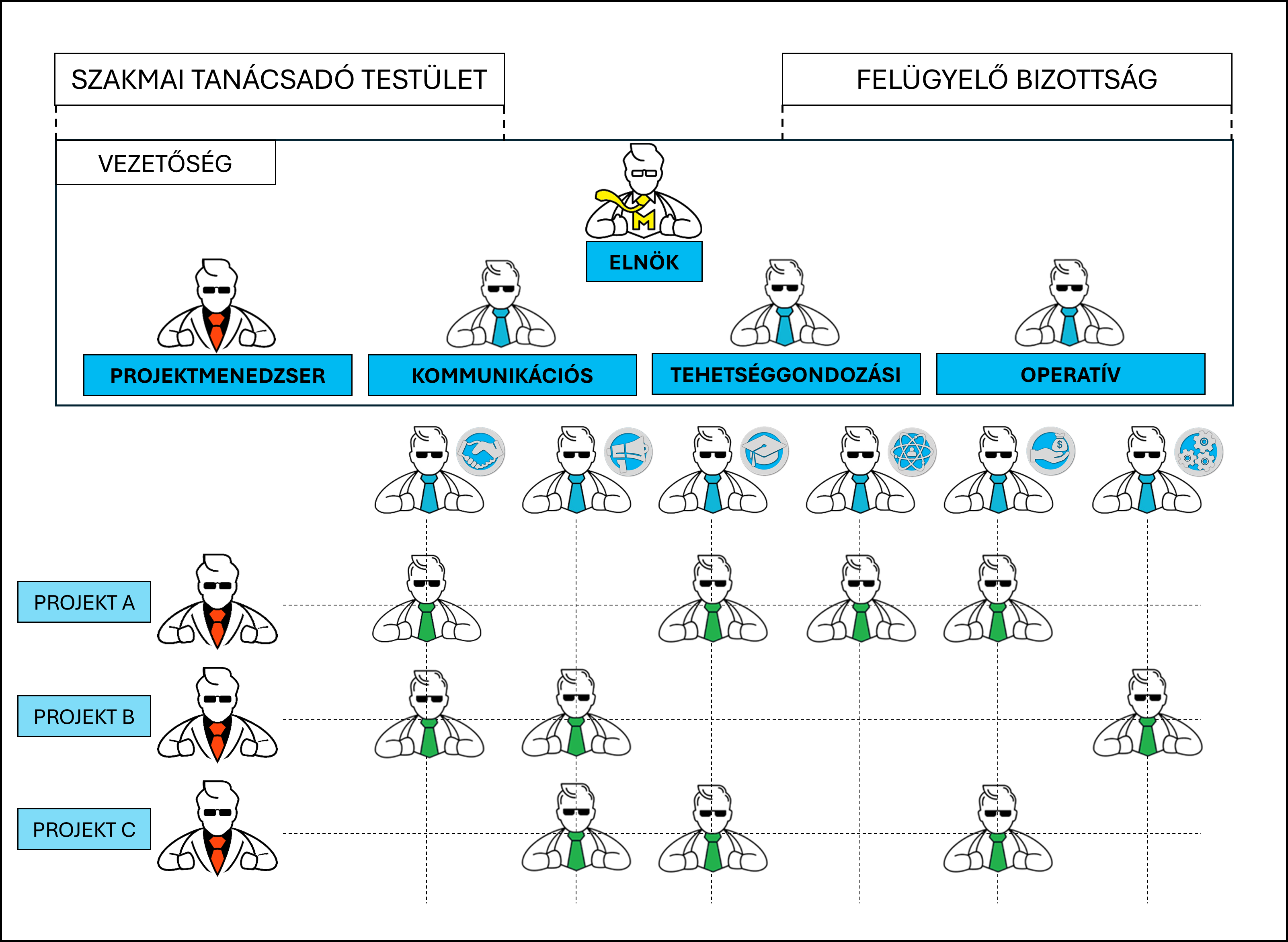 A másik fontos eleme az MSZK-nak a működése, ami igazán szokatlan a szakkollégiumok körében. Mi egy leadership playground vagyunk, ami annyi jelent, hogy az egész működés arra van kiépítve, hogy bárki kipróbálhassa magát vezetői pozícióban, 4-6 ember élén. Minden területnek, részlegnek és projektnek van vezetője, akinek feladata az adott munkakör koordinálása.
